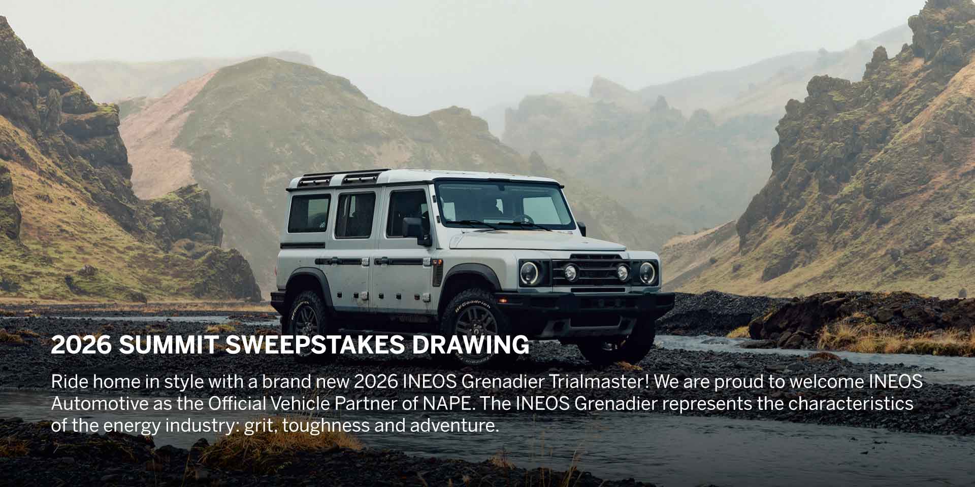 Ride home in style with a BRAND NEW 2026 INEOS GRENADIER TRIALMASTER. We are proud to welcome INEOS Automotive as the Official Vehicle Partner of NAPE. The INEOS Grenadier represents the characteristics of the energy industry: grit, toughness and adventure.